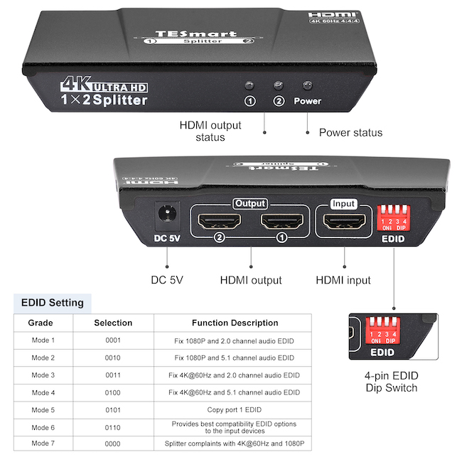 • HDMI Splitter 1 in 2 out with CEC – Easily distributes 1 Ultra HD HDMI source to 2 Ultra HD displays simultaneously with same images. – Supports 3 CEC commands: One Touch Play, System Standby and Remote Control Pass Through. NOTE: The premise is that your input and output devices support CEC.